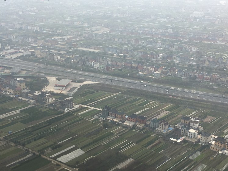 As we descend, multi coloured patchwork quilt strips of land spread out below us. They are surrounded by row upon row of identical living quarters both high rise and low rise, which are in turn intersected by vast multi-laned highways. And everything is shrouded in that shimmering layer of endless hanging smog. The inner China heartland is laid bare in all its humdrum glory, for the aerial passengers delight and delectation from above, as the soothing operatic music heralds our imminent arrival.